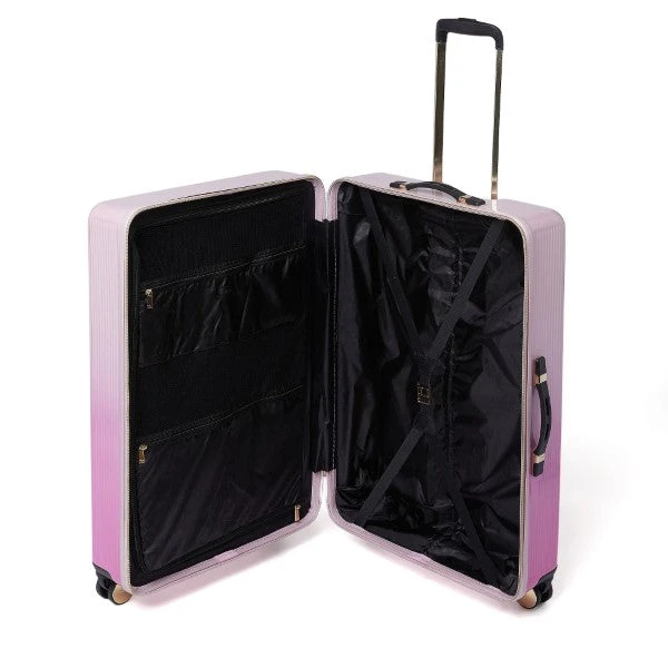 The Olive collection is made from a superlight and strong material which is impact resistant. Four smooth double wheels with 360° rotation and Dune London logo hubcaps. Internal pockets and straps for organised packing. A lightweight trolley system with signature gold finish. TSA Padlock included. A 2-year manufacturer’s warranty